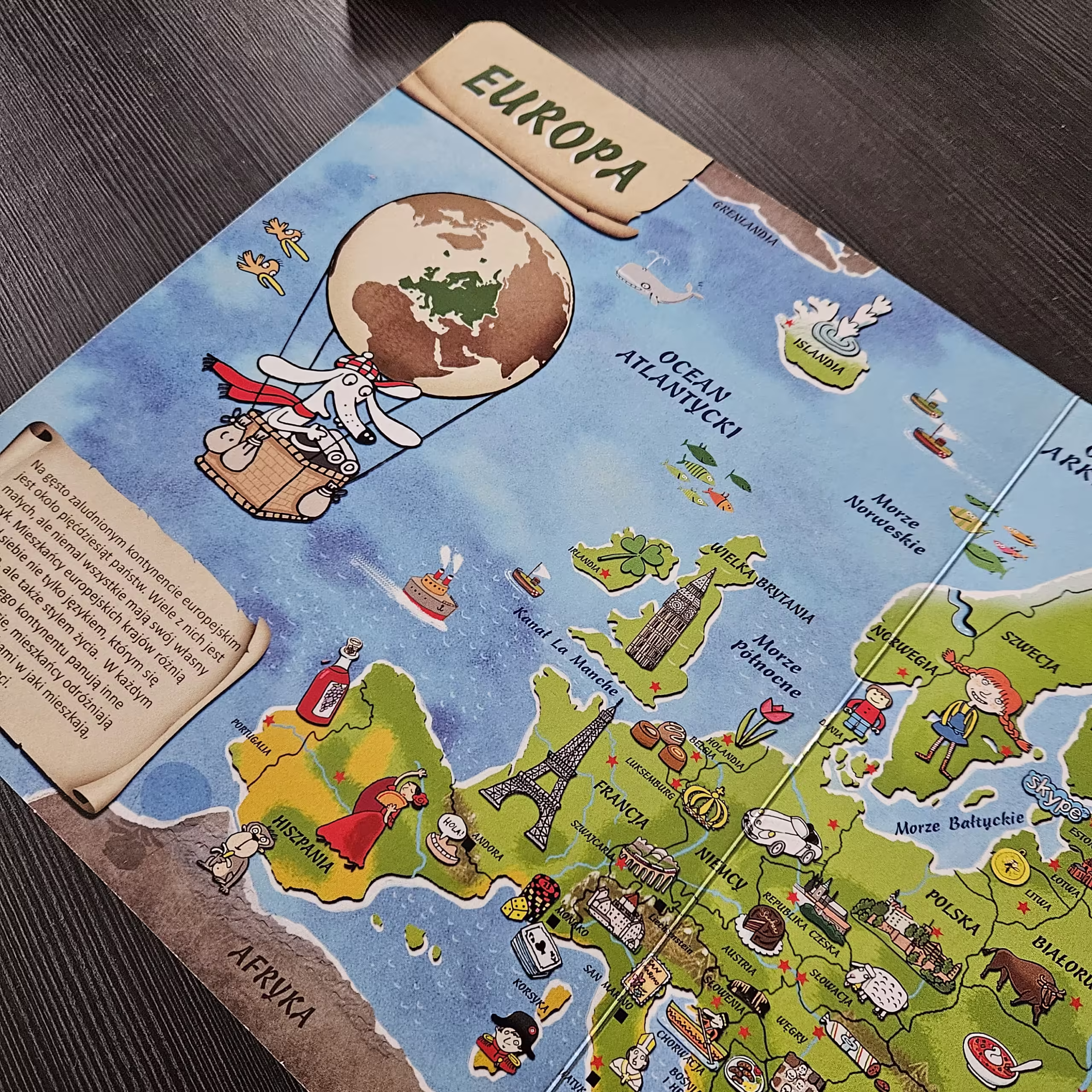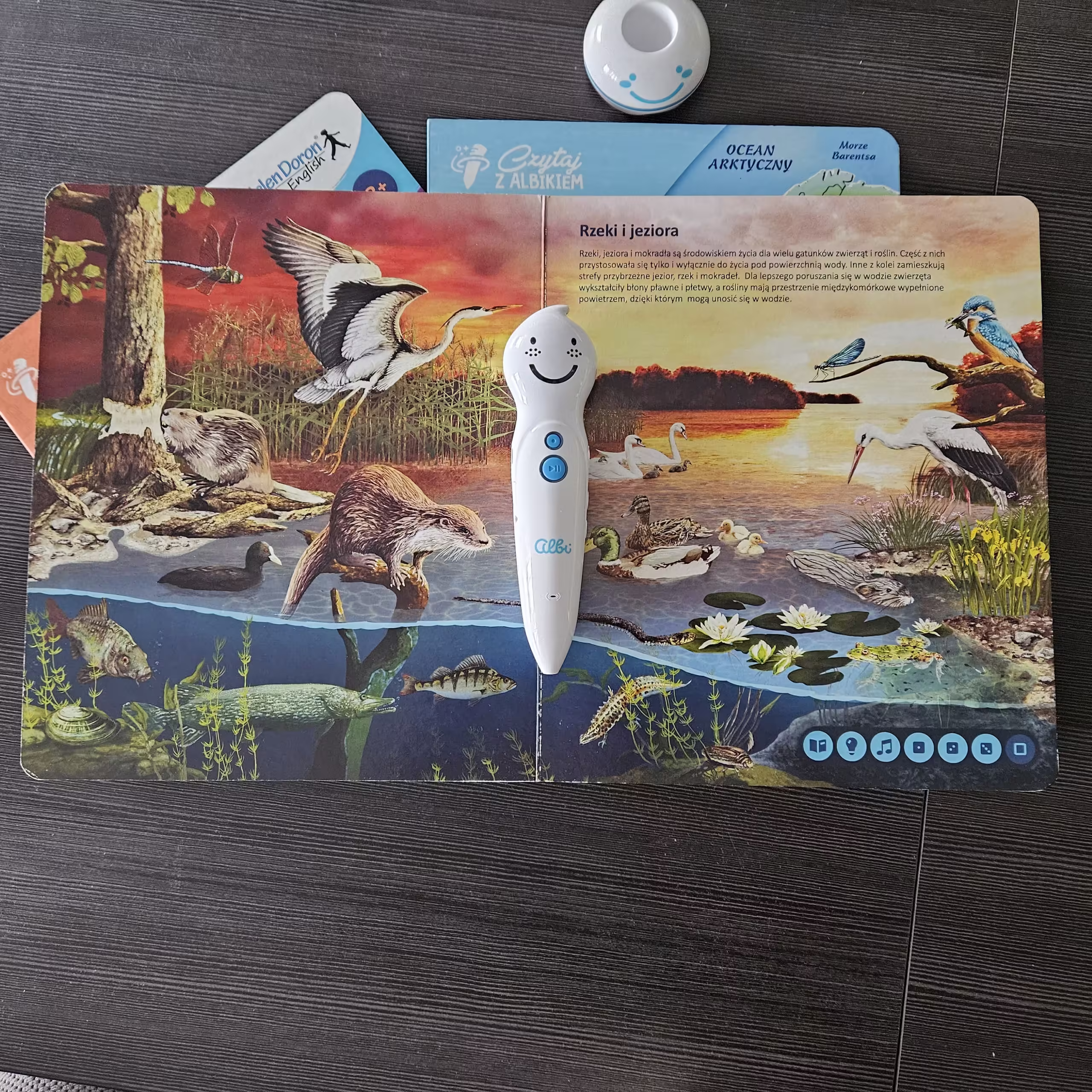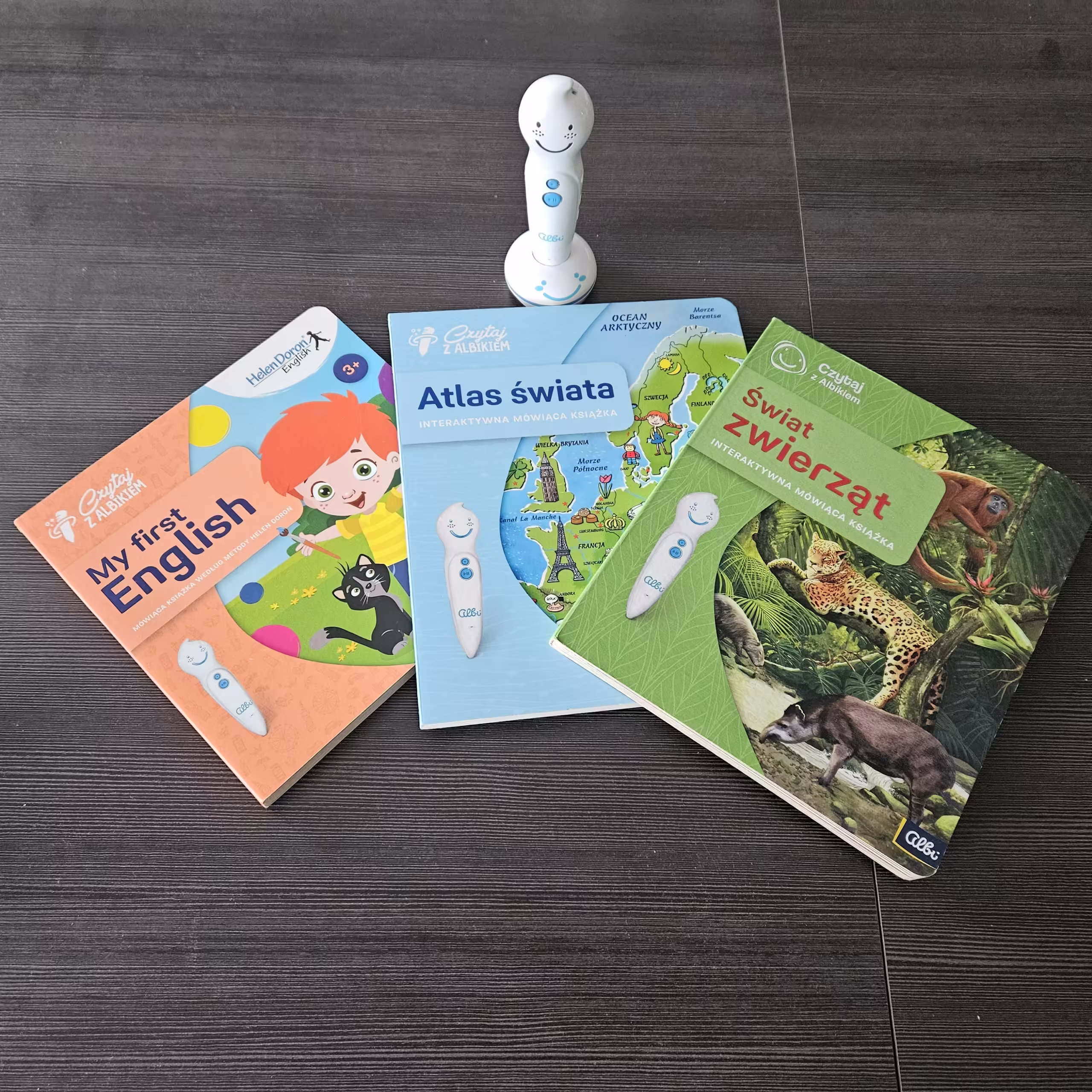 Zostawiłam tę pozycję na koniec. Jeśli macie możliwość zabrania czegoś większego, książeczka z serii Czytaj z Albikiem zajmie dziecko na dłużej, łącząc zabawę z nauką. Dla tych, którzy jeszcze tego produktu nie znają – to interaktywne mówiące książki, które działają ze specjalnym piórem – aktywuje ono zakodowane w nich dźwięki. My mamy aktualnie trzy pozycje; Świat zwierząt, My first English oraz Atlas świata. (Mieliśmy jeszcze Wesołą naukę, ale już ruszyła w świat). Wystarczy przyłożyć pióro, a usłyszymy dźwięk zapisany pod danym obrazkiem – informację o np. danym zwierzęciu. Ponadto w książce są zawarte quizy, piosenki, historyjki – możliwości jest naprawdę sporo. Dzięki oznaczeniom wiekowym, łatwo można dopasować pozycję do wieku dziecka. Pióro ma jeszcze jedną funkcję – może odtwarzać muzykę, można podłączyć słuchawki, a kiedy dokupimy specjalne naklejki, daje możliwość nagrywania dźwięków. Cała seria regularnie powiększa się o nowe tytuły, które możecie sprawdzić np. tutaj.