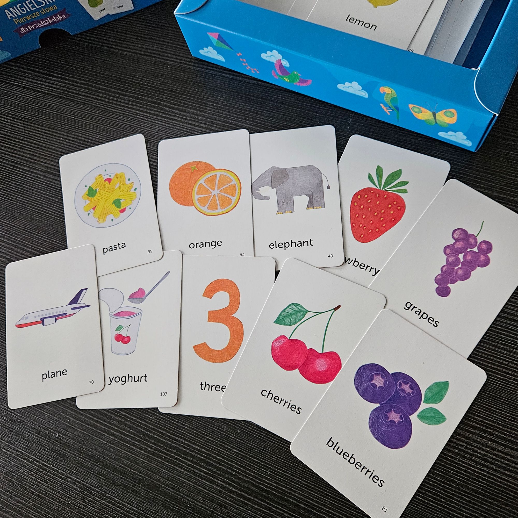 Kupiłam je kiedyś w Biedronce i tak (ostatnio niestety nie tak regularnie, jakbym chciała) powtarzamy je z Alą, co jest dodatkową formą nauki angielskiego poza jej zajęciami w szkole językowej. Sprawdziły się nie tylko w podróży; zdarzyło mi się zabrać je do lekarza i przydały się jak utknęłyśmy w przychodni oczekując na opóźnioną wizytę. Czasem powtarzamy sporą część pudła (jak Ala ma dobry nastrój), czasem zaledwie kilka fiszek.