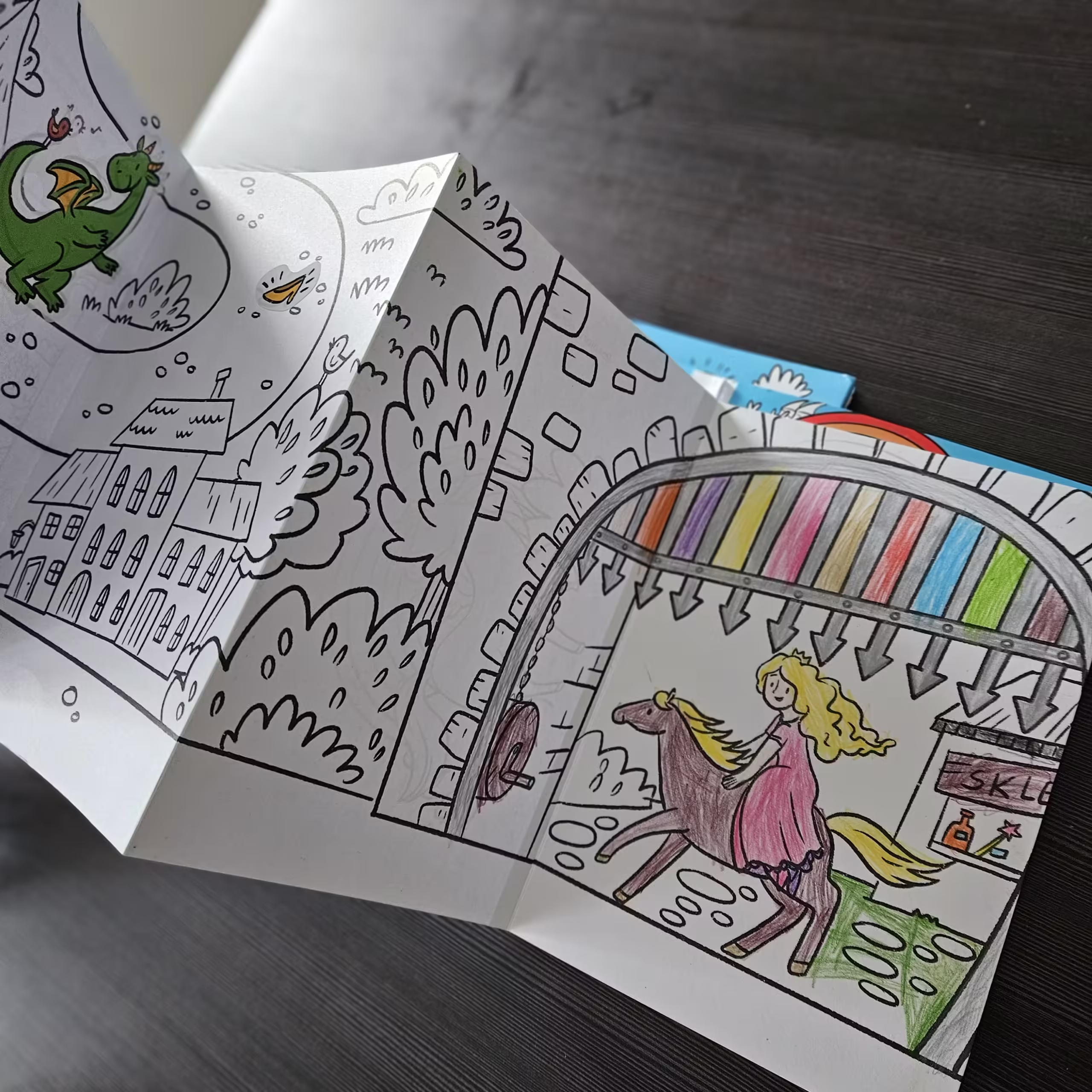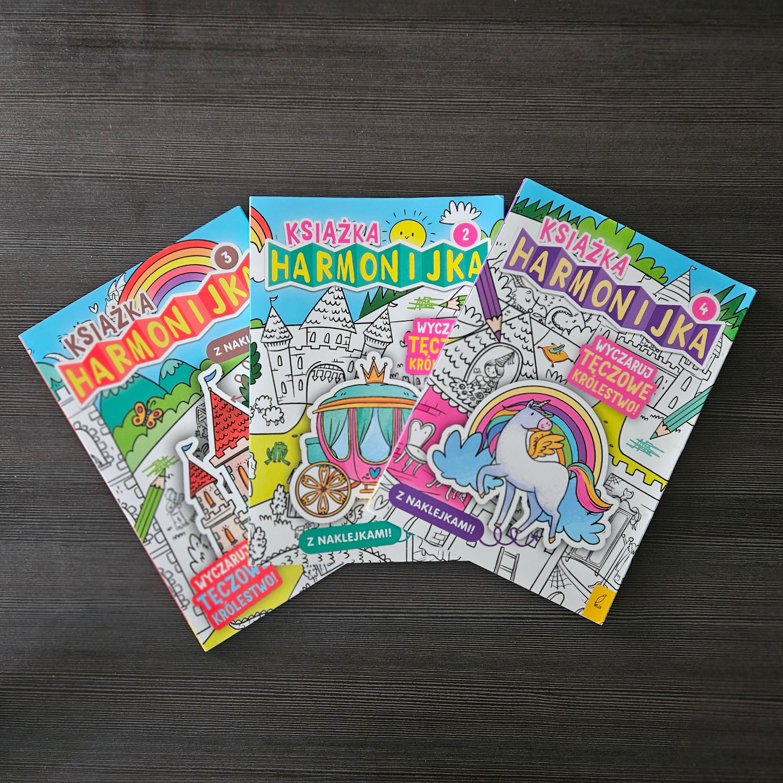 Niby oczywiste, ale uznałam, że warto o nich wspomnieć, jeśli wiemy, że nasze dziecko lubi w ogóle kolorować. My zawsze zabieramy choć jedną. Nie polecę konkretnych tytułów, my kierujemy się aktualnymi zainteresowaniami Ali (ostatnio głównie LEGO), ale z ciekawych pozycji pokażę Wam kolorowanki – harmonijki autorstwa ilustratorki Natalii Berlik. Tak się składa, że z Natalią miałam okazję współpracować i przy jednym ze spotkań dała mi cztery części takich harmonijek (dobra wiadomość – jest również seria dla chłopców). Sprawdziły nam się w aucie, bo można kolorować w duecie i format również jest całkiem przyjazny.